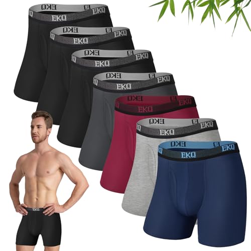 – MATERIAL SÚPER SUAVE Y TRANSPIRABLE: los calzoncillos boxers para hombre EKQ están hechos de 95% rayón hecho de bambú y 5% spandex, que son súper transpirables, suaves y livianos, absorben instantáneamente la humedad y lo mantienen fresco y seco durante todo el día. Nuestro paquete de 7 calzones para hombre proporciona un ajuste cómodo y elástico, lo que te permite sentirte mejor todos los días