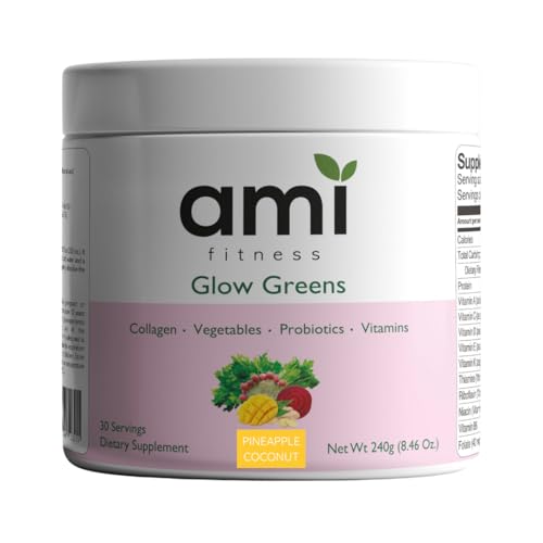 Ami Fitness Glow Greens, Polvo Verde con Colágeno – 30ct, Piña Coco