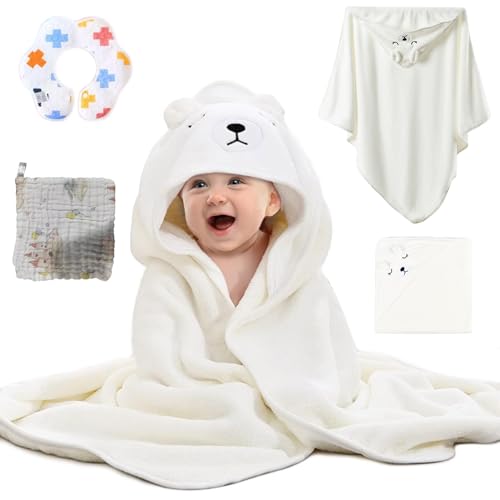 SOZOMO Toalla de Baño para Bebe,Baby Toalla de Baño para Bebe con Capucha,Toalla para Bebe Super Absorbente,con Toalla pequeña y Baberos para Bebé,Toallas de Baño para Niñas Niños (Blanco)